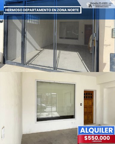 ALQUILER EN KM8 Estudio FLAMIG ofrece hermoso departamento en planta baja 1 habitación 1 baño Living comedor Cocina integrada con parrilla Patio Ingreso de auto $550.000 + servicios Barrio Km 8