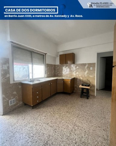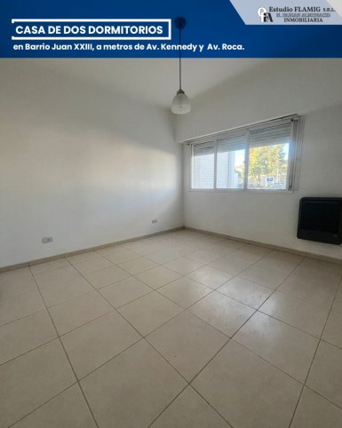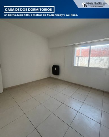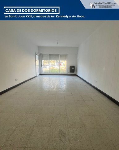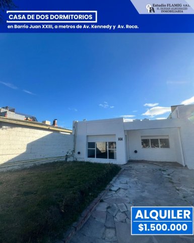 ESTUDIO FLAMIG ALQUILA CASA en Barrio Juan XXIII, a metros de Av. Kennedy y Roca. Espacios amplios y cómodos: Living Cocina 2 Dormitorios Entrada para vehículo Patio delantero y trasero $1.500.000 Aumento cuatrimestral