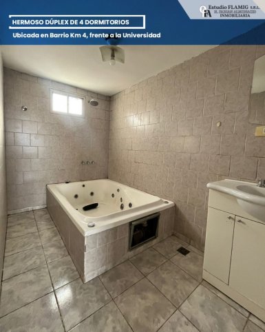 Dúplex en Barrio Km 4, frente a la Universidad Ubicación estratégica con todo al alcance Comedor amplio Cocina funcional Quincho ideal para encuentros 4 dormitorios 3 baños (uno en suite con hidromasaje) Amplio patio Vista privile