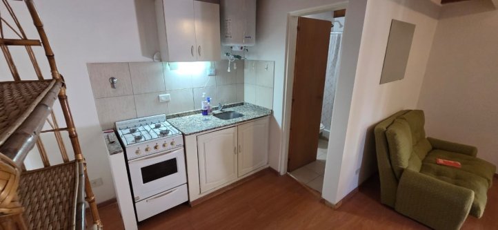 El departamento está compuesto en plata baja por una cocina - comedor muy cómoda y completa, un baño y en planta alta un dormitorio. Cuenta con algunos muebles y una parrilla en el patio que se comparte con otro departamento de igual característica. Es apto y cómodo para persona sola o pareja sin hijos y sin mascota.